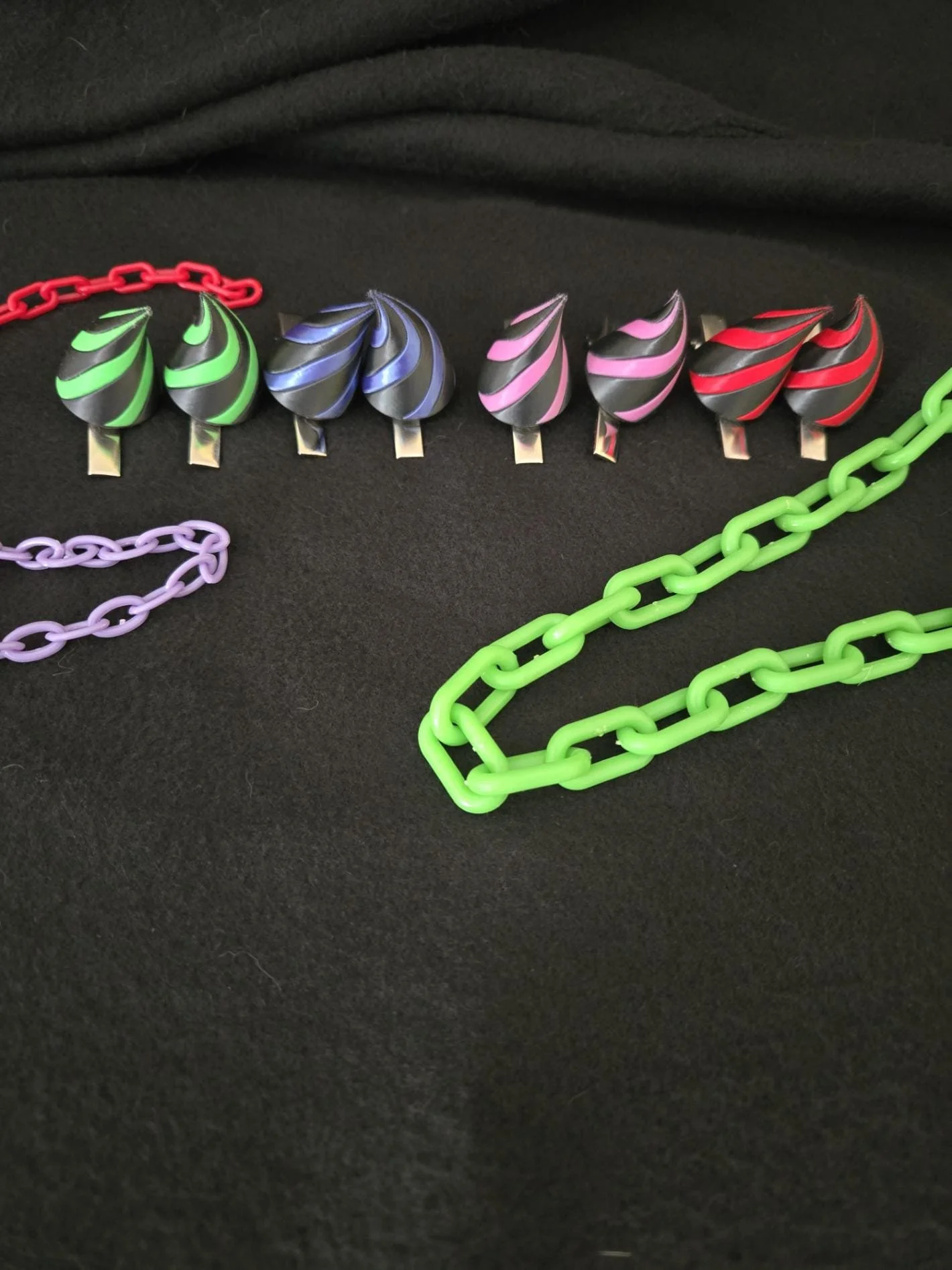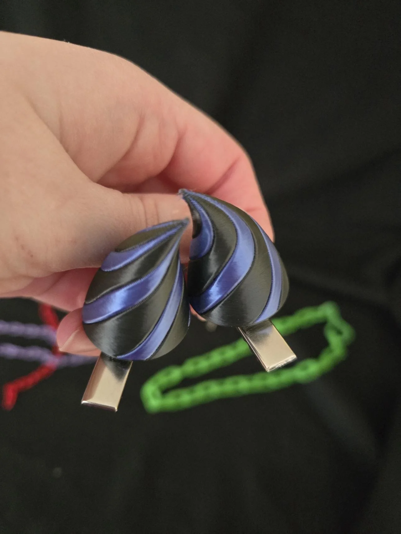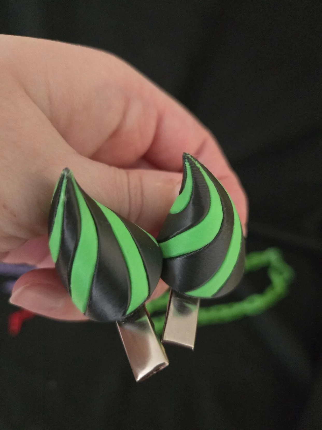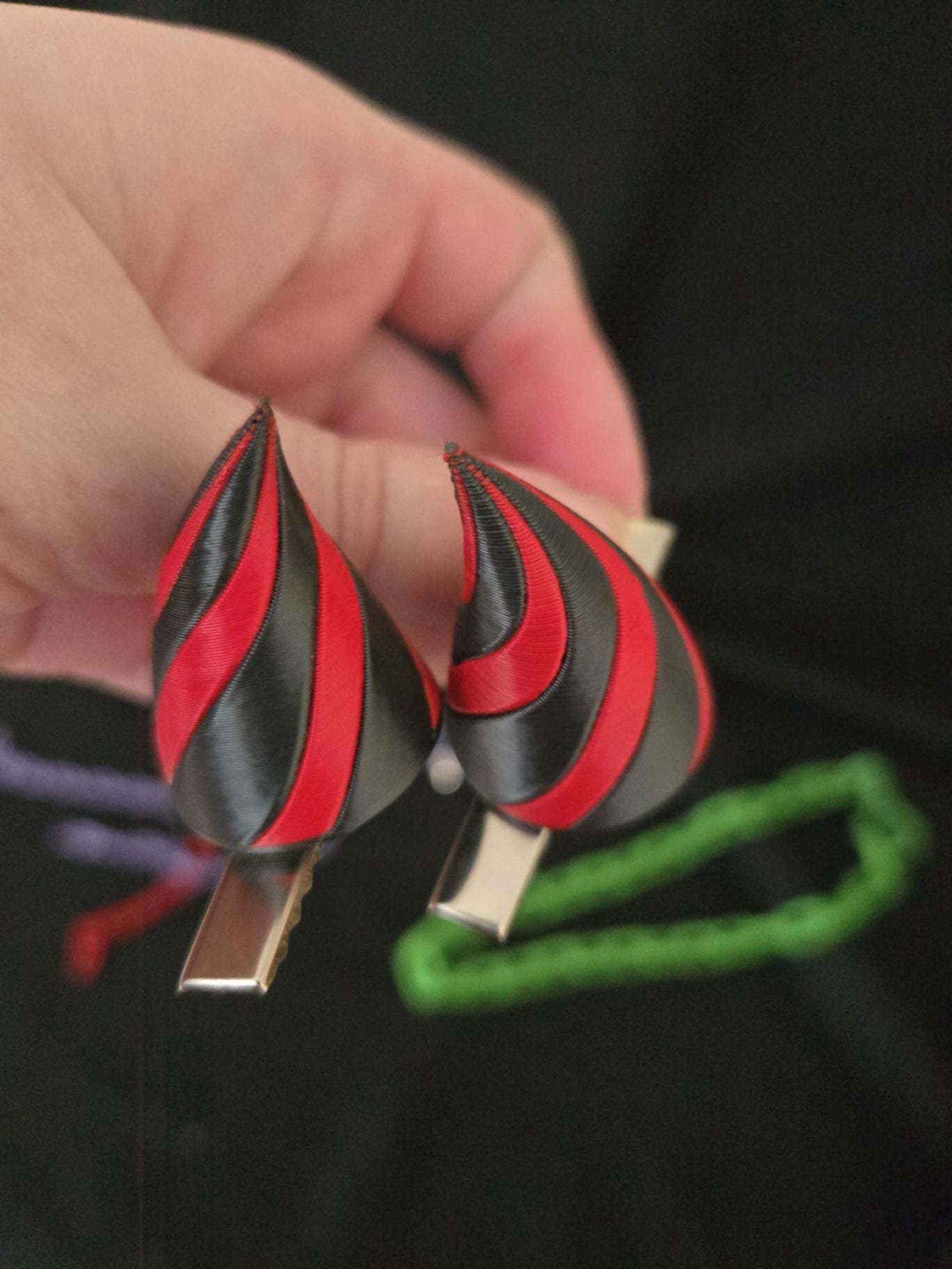 My classic mini horn shape on clips, but with a swirly spiral pattern in two colors!