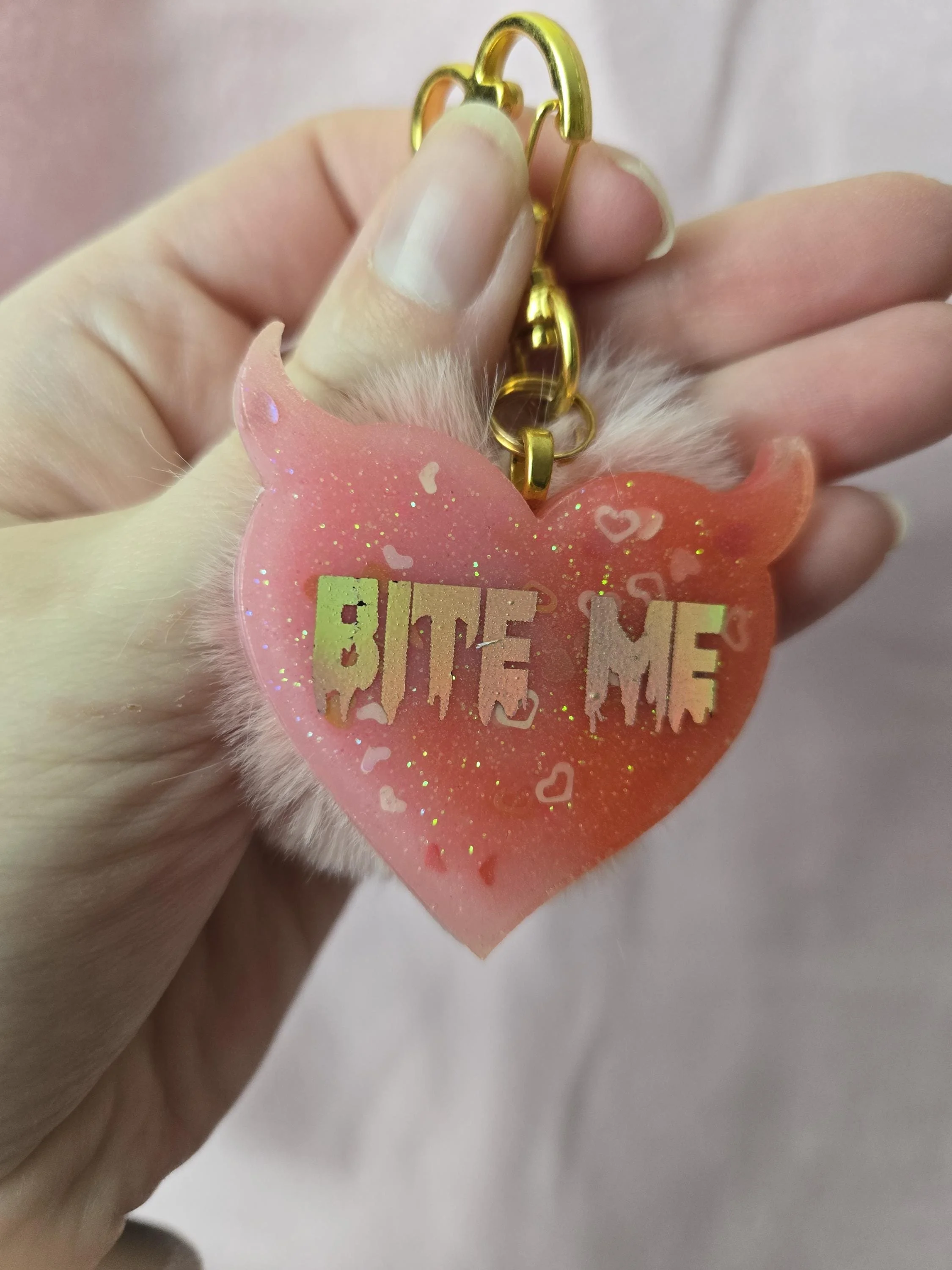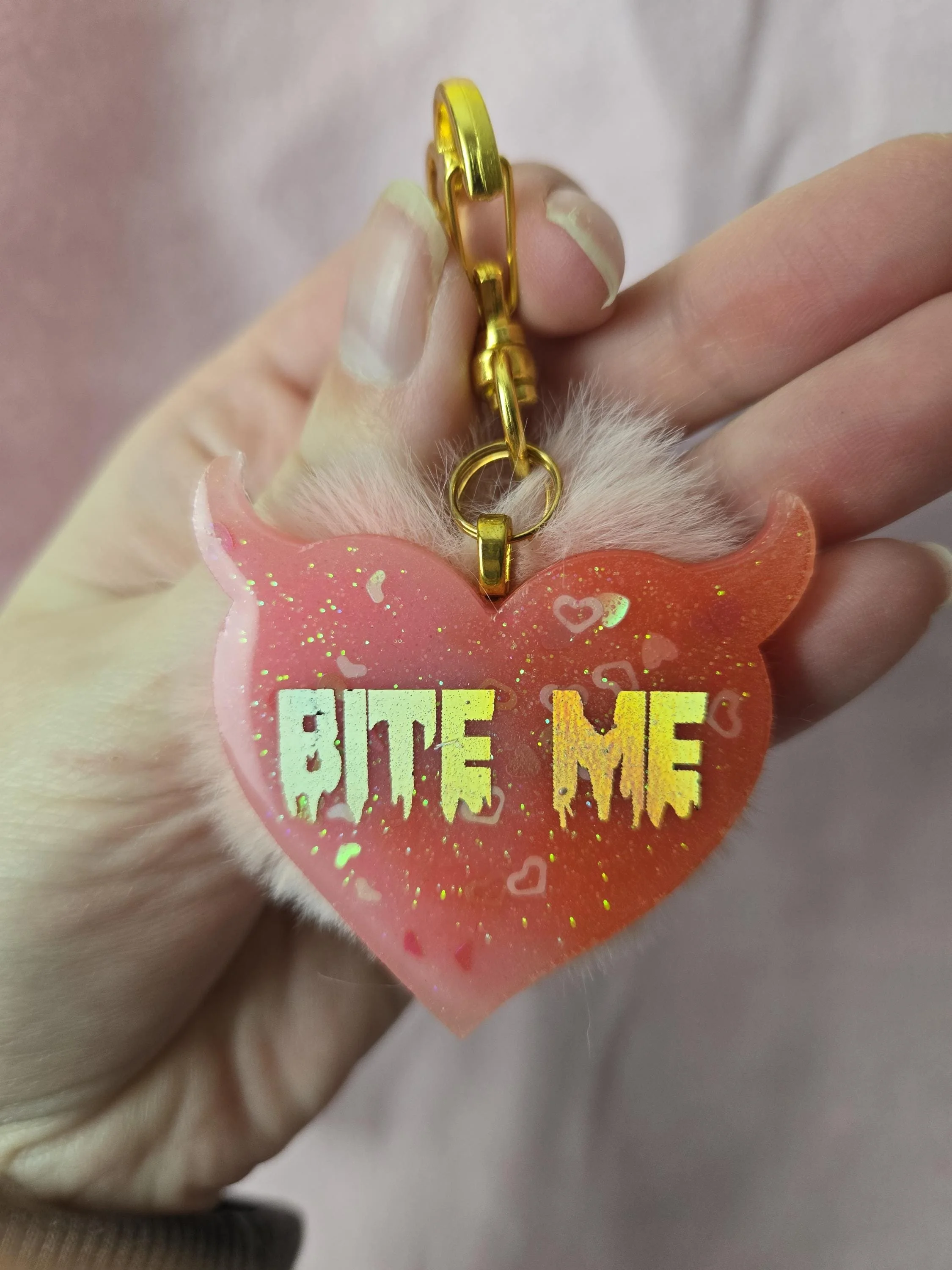 Shop › Bite Me! Bag Charm w/ Puffball Image 1 of 3 Image 2 of 3 Image 3 of 3 Bite Me! Bag Charm w/ Puffball $10.00 A devil-heart shaped resin bag charm/ keychain with BITE ME in holographic lettering! Comes with a golden clasp and matching puff. Add To Cart Added! A devil-heart shaped resin bag charm/ keychain with BITE ME in holographic lettering! Comes with a golden clasp and matching puff.
