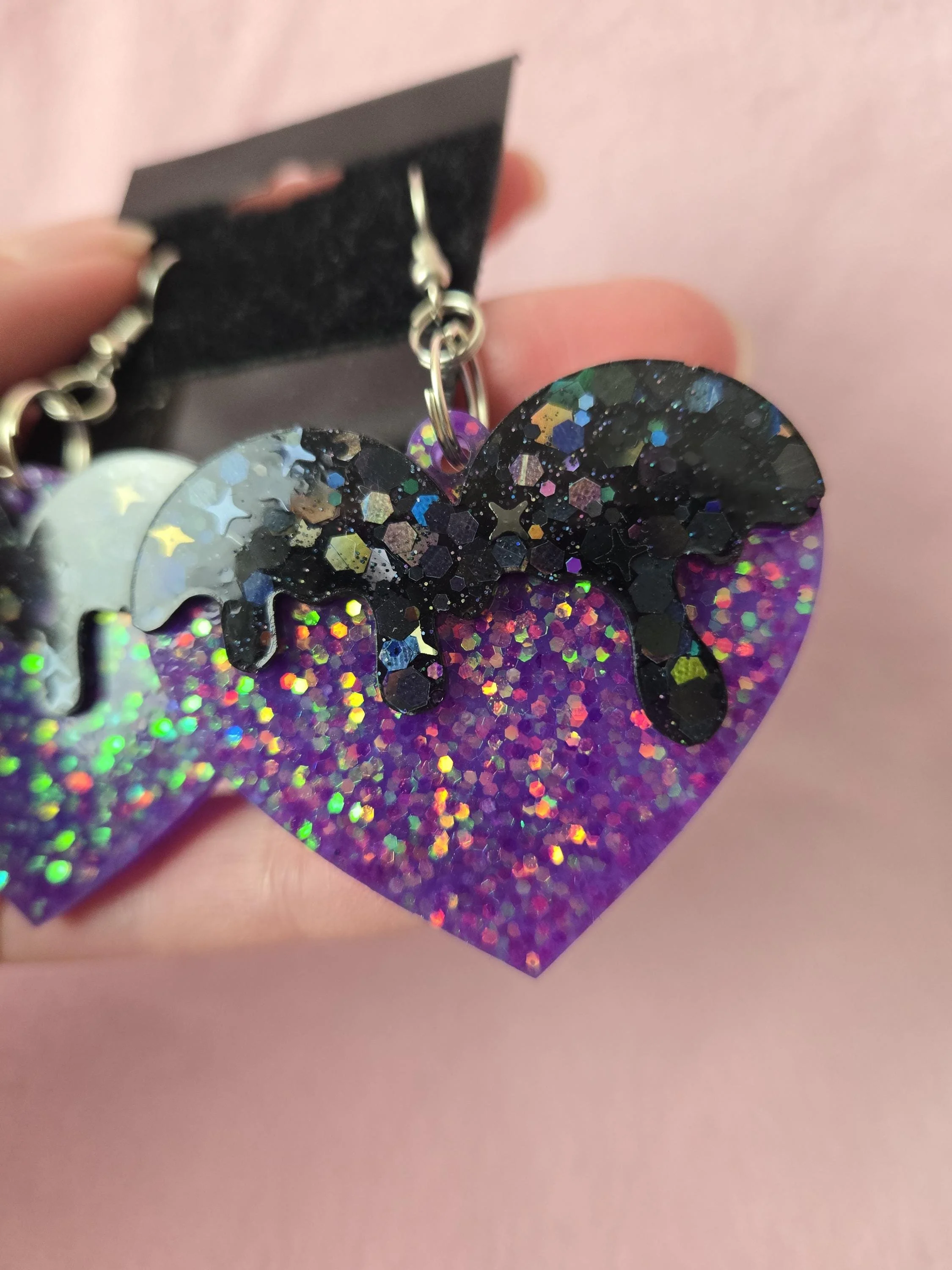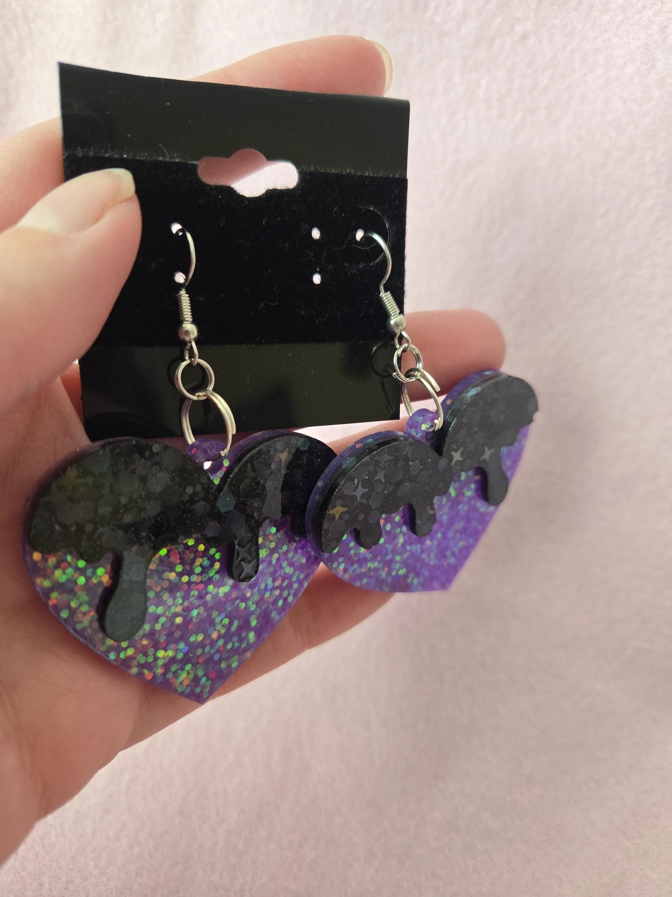 Handmade with love! These earrings are made with nickel-free metal & a glittery black and purple resin in a drippy heart design. Comes with a plastic earring stopper!