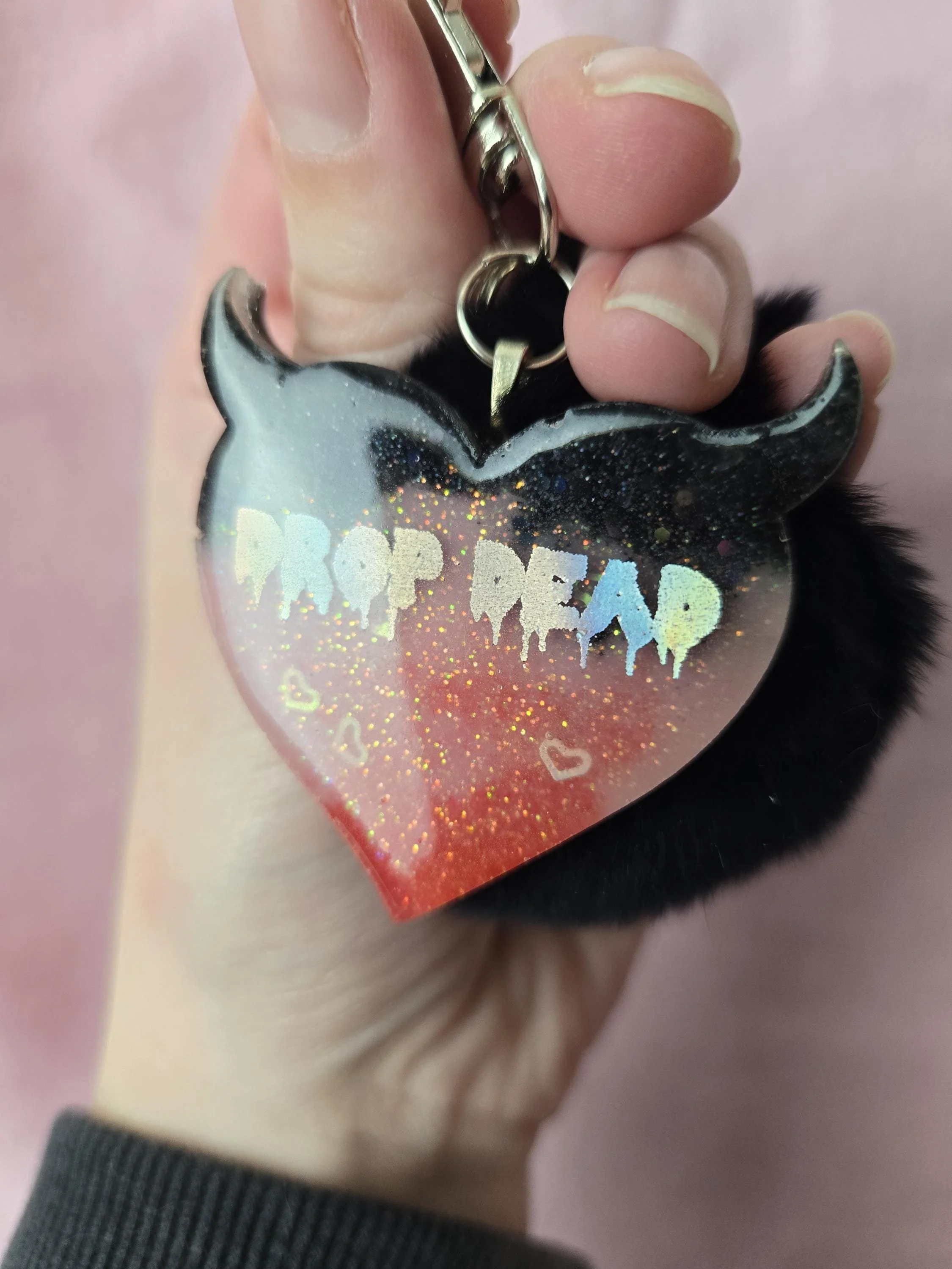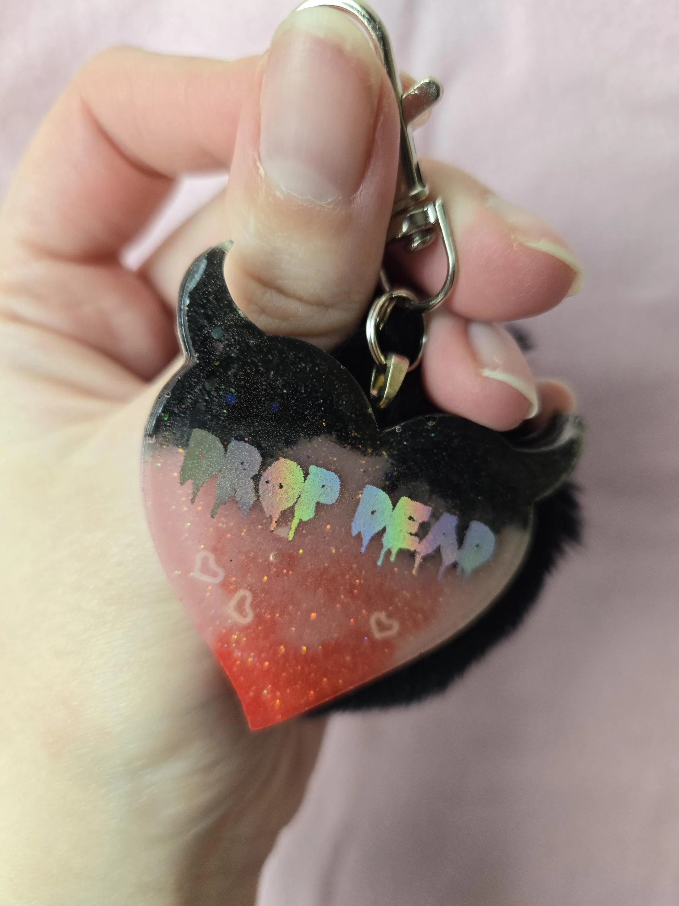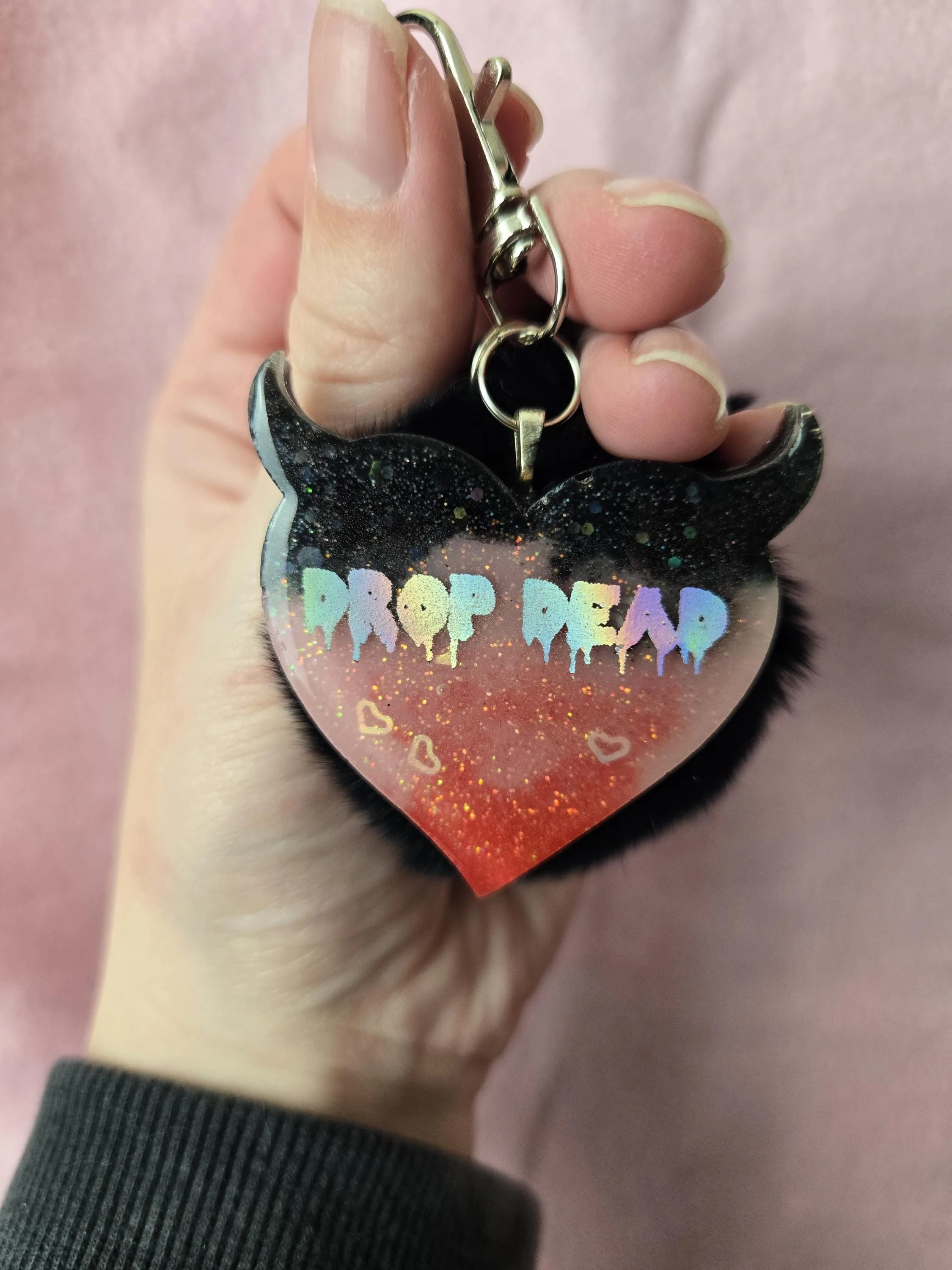 Shop › Drop Dead! Bag Charm w/ Puffball Image 1 of 3 Image 2 of 3 Image 3 of 3 Drop Dead! Bag Charm w/ Puffball $10.00 A devil-heart shaped resin bag charm/ keychain with DROP DEAD in holographic lettering! Comes with a silver clasp and matching puff. Add To Cart Added! A devil-heart shaped resin bag charm/ keychain with DROP DEAD in holographic lettering! Comes with a silver clasp and matching puff.