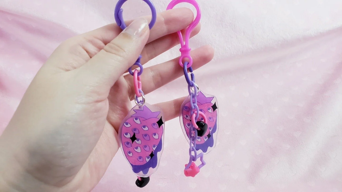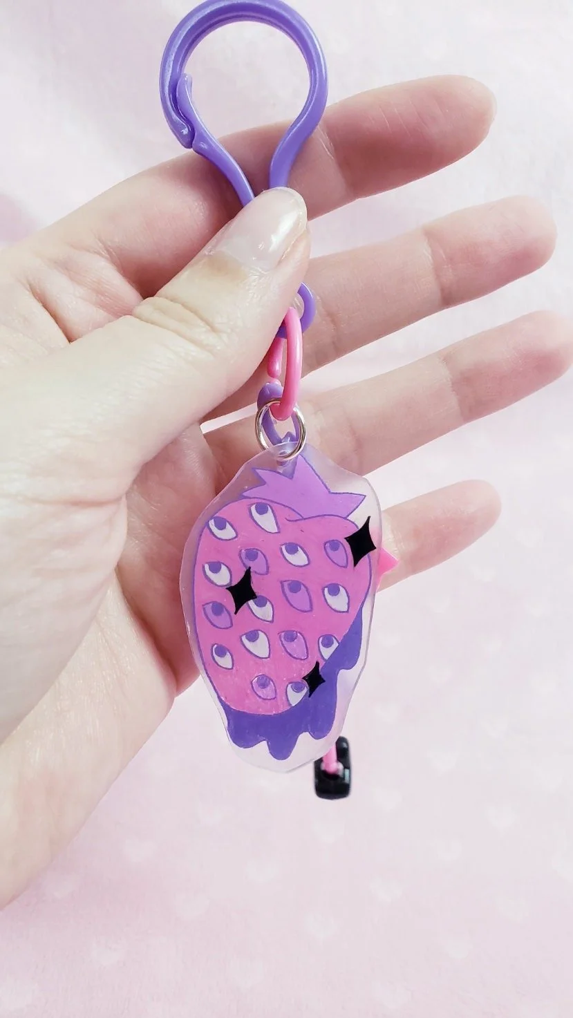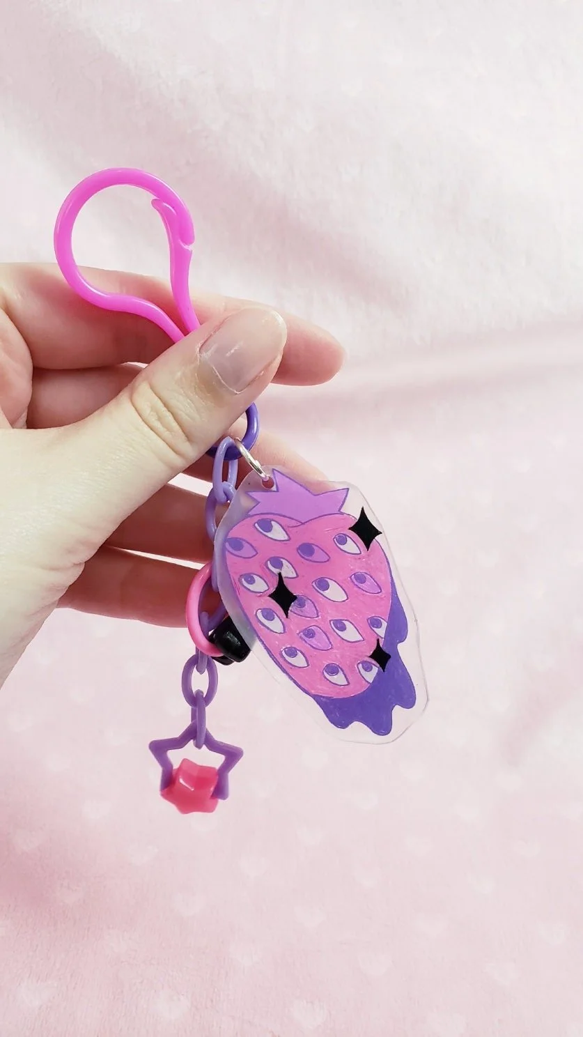 Shop › eyeball strawberry shrinky dink keychains | alt style keychain | plastic keychains | pastel goth Image 1 of 4 Image 2 of 4 Image 3 of 4 Image 4 of 4 eyeball strawberry shrinky dink keychains | alt style keychain | plastic keychains | pastel goth from $15.00 A set of very normal looking eyeball strawberry keychains! Sold individually or together. Made from shrinky dinks and hand-drawn, finished with resin on one side + added cute plastic beads and keychain clasps. Primary color: Select Primary color purple clasp pink clasp both Add To Cart Added! A set of very normal looking eyeball strawberry keychains! Sold individually or together. Made from shrinky dinks and hand-drawn, finished with resin on one side + added cute plastic beads and keychain clasps.