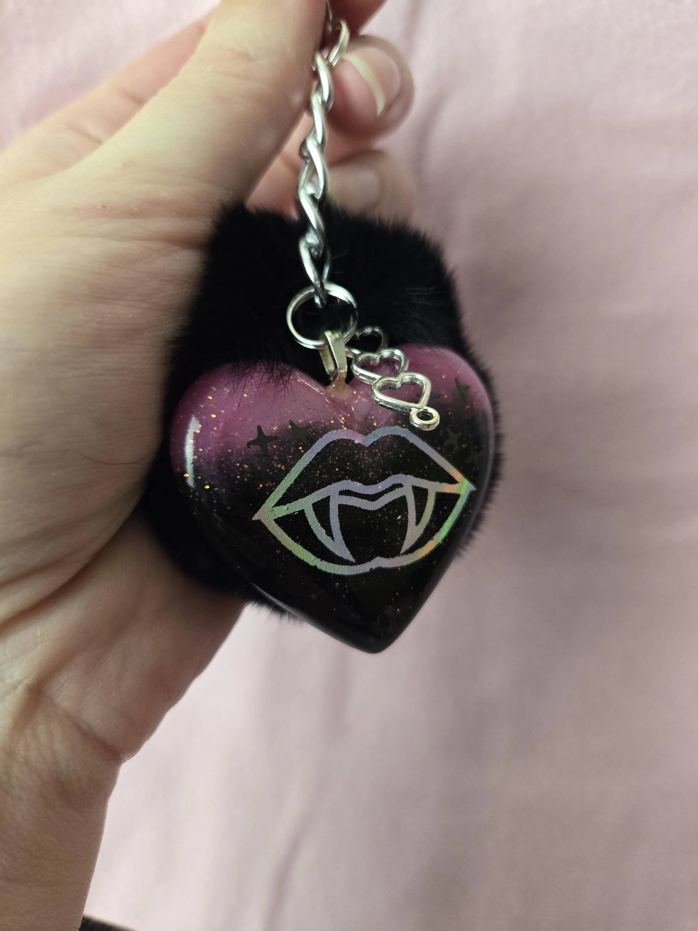 A heart-shaped keychain with fanged/ vampire lips in holographic silver, and black and pink resin! Comes with a silver clasp, silver heart charm, and black puff.