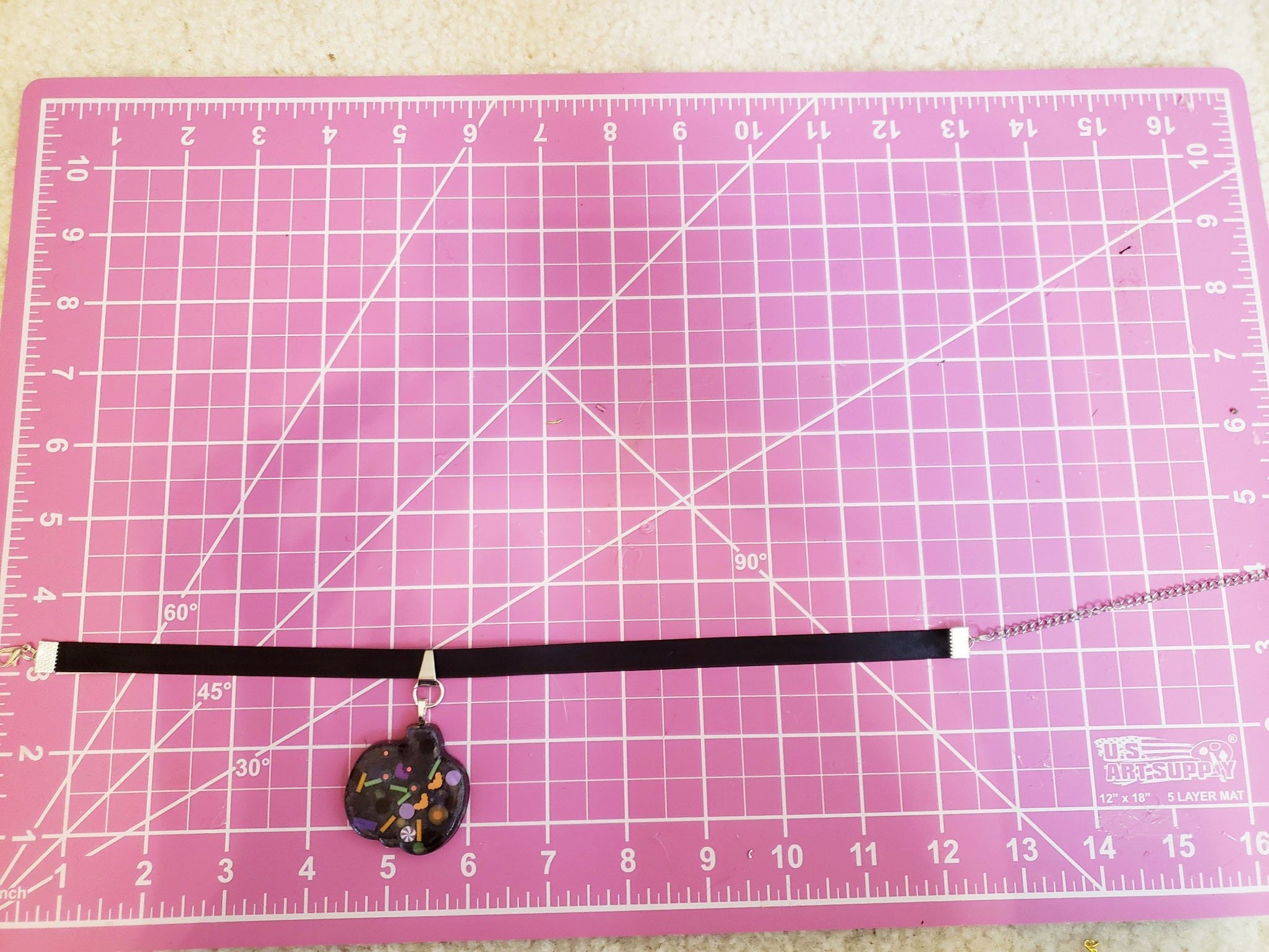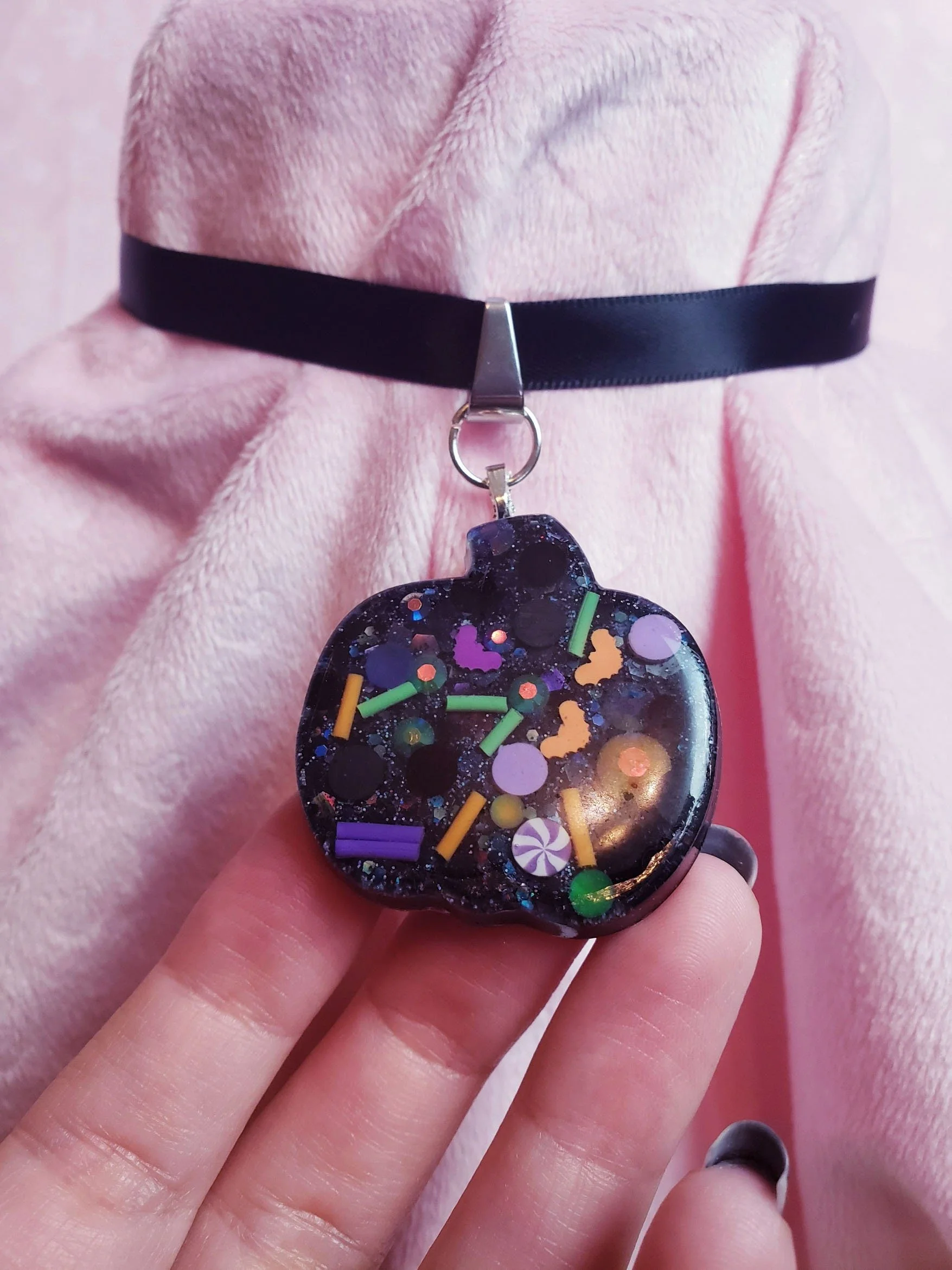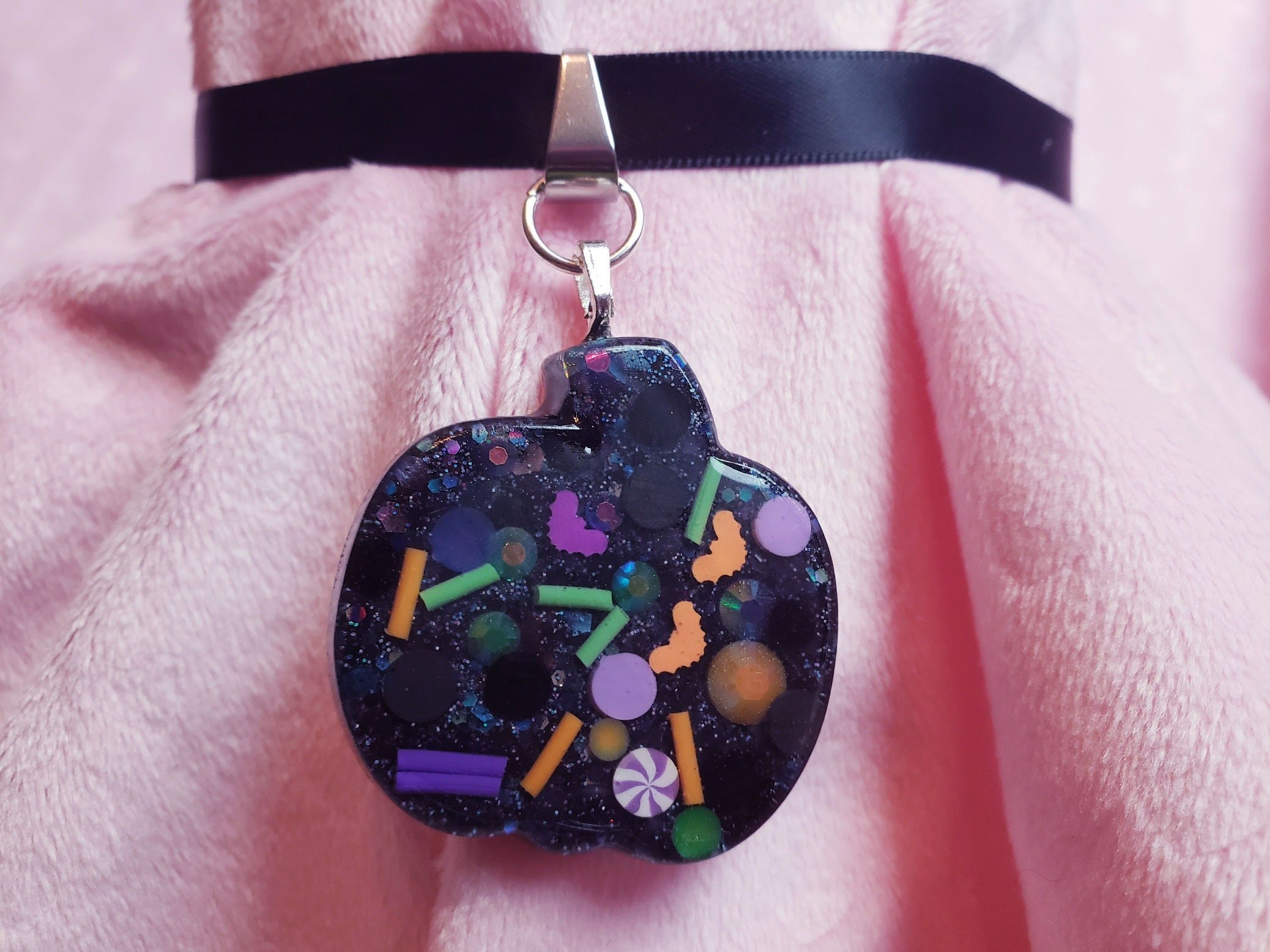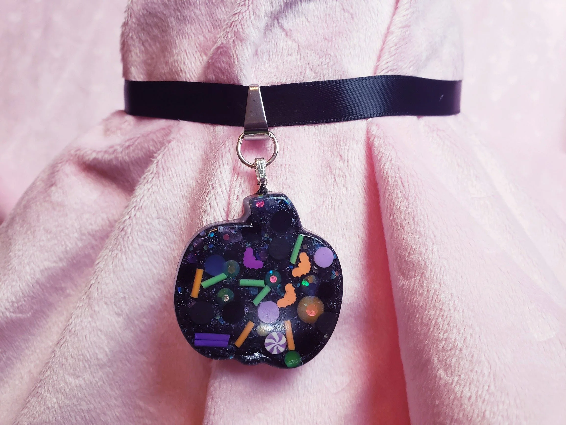 This simple design packs a punch with a pumpkin-shaped resin pendant absolutely stuffed full of Halloween confetti and glitter! The super-soft black satin ribbon will be extra comfy to wear on Halloween night, or just whenever you need a dash of spookiness in your life.