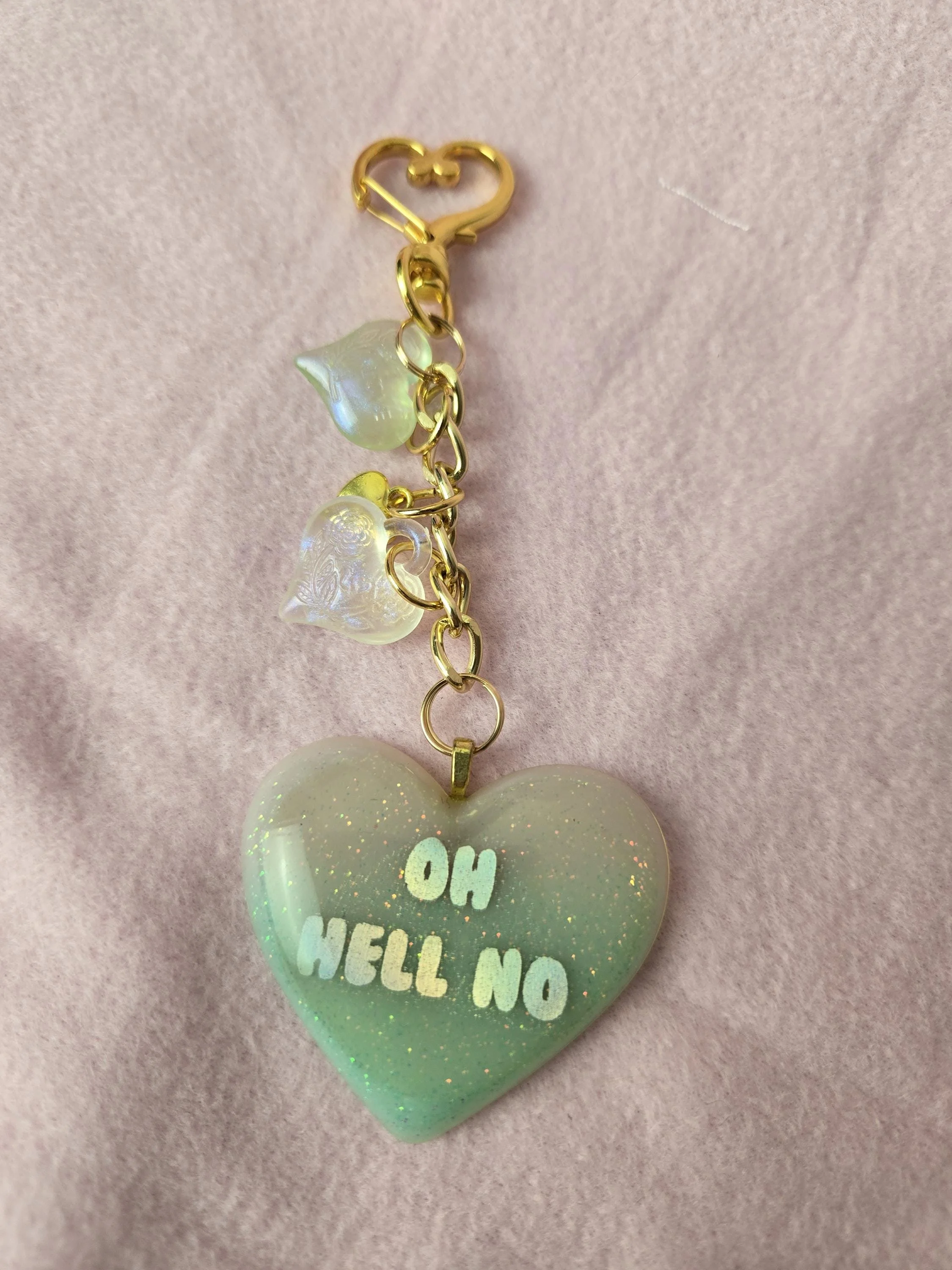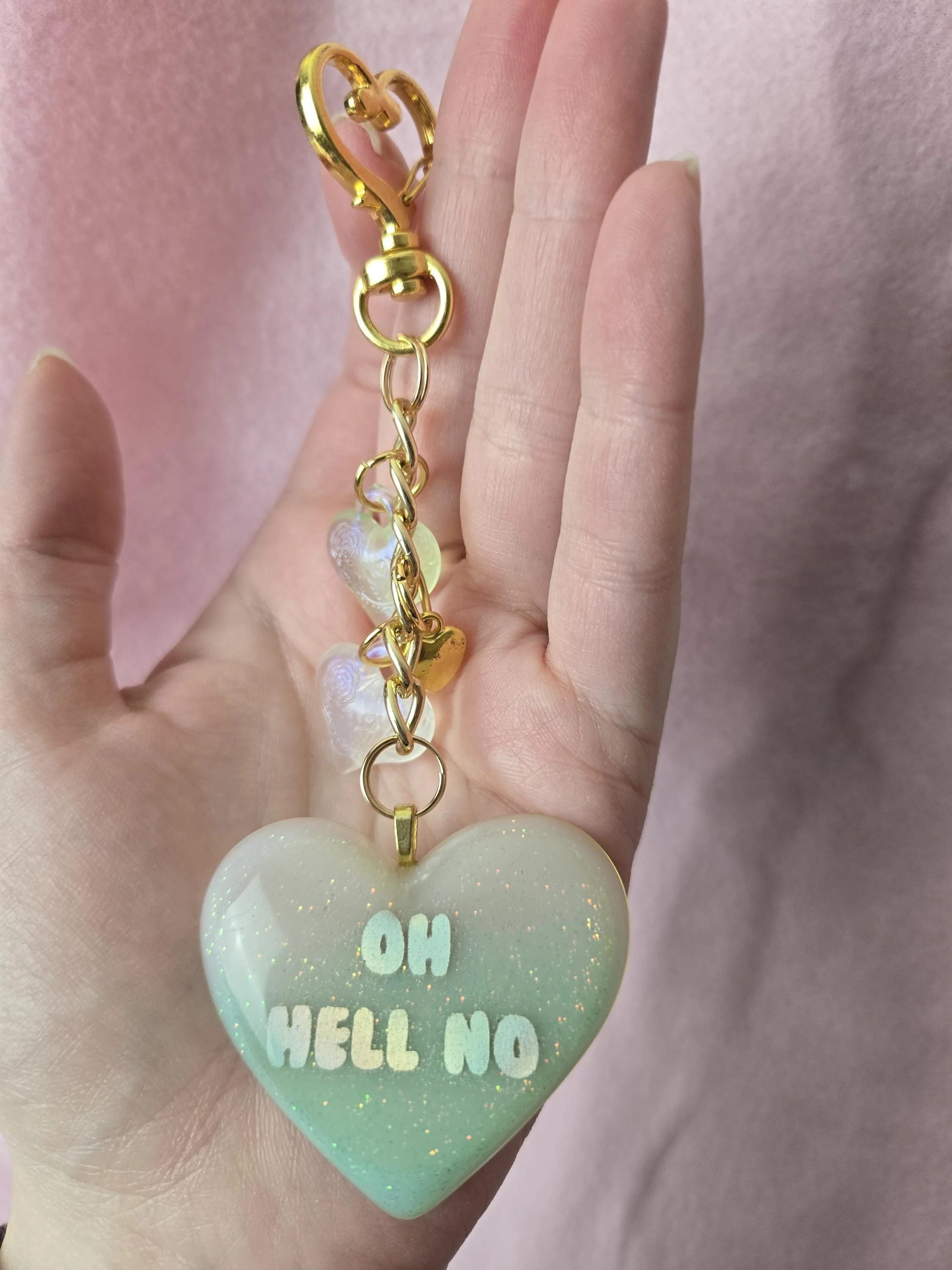 Shop › Oh Heck No! Pastel Mint & Purple Keychain Image 1 of 3 Image 2 of 3 Image 3 of 3 Oh Heck No! Pastel Mint & Purple Keychain $10.00 A heart-shaped keychain with OH HECK NO in holographic lettering, with two jelly heart charms. Add To Cart Added! A heart-shaped keychain with OH HECK NO in holographic lettering, with two jelly heart charms.