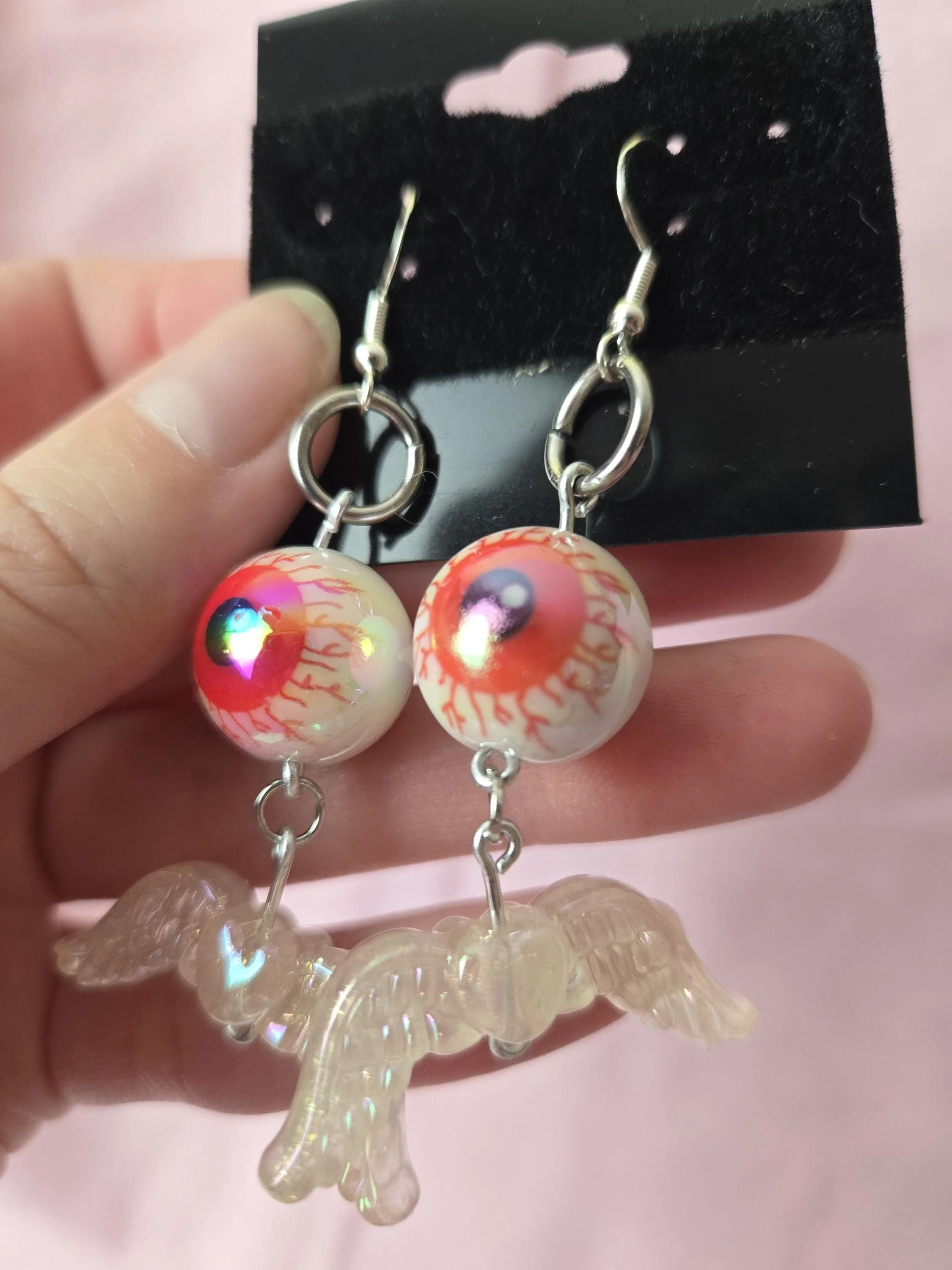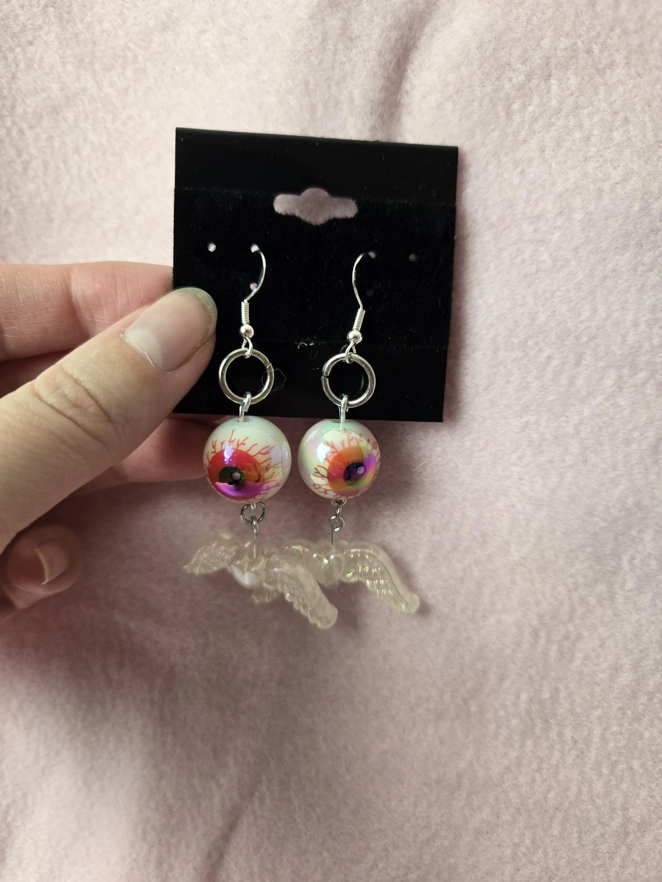 Handmade with love! These earrings are made with nickel-free metal & will catch the eye with their holographic eyeball and heart-wing charms. Comes with a plastic earring stopper!
