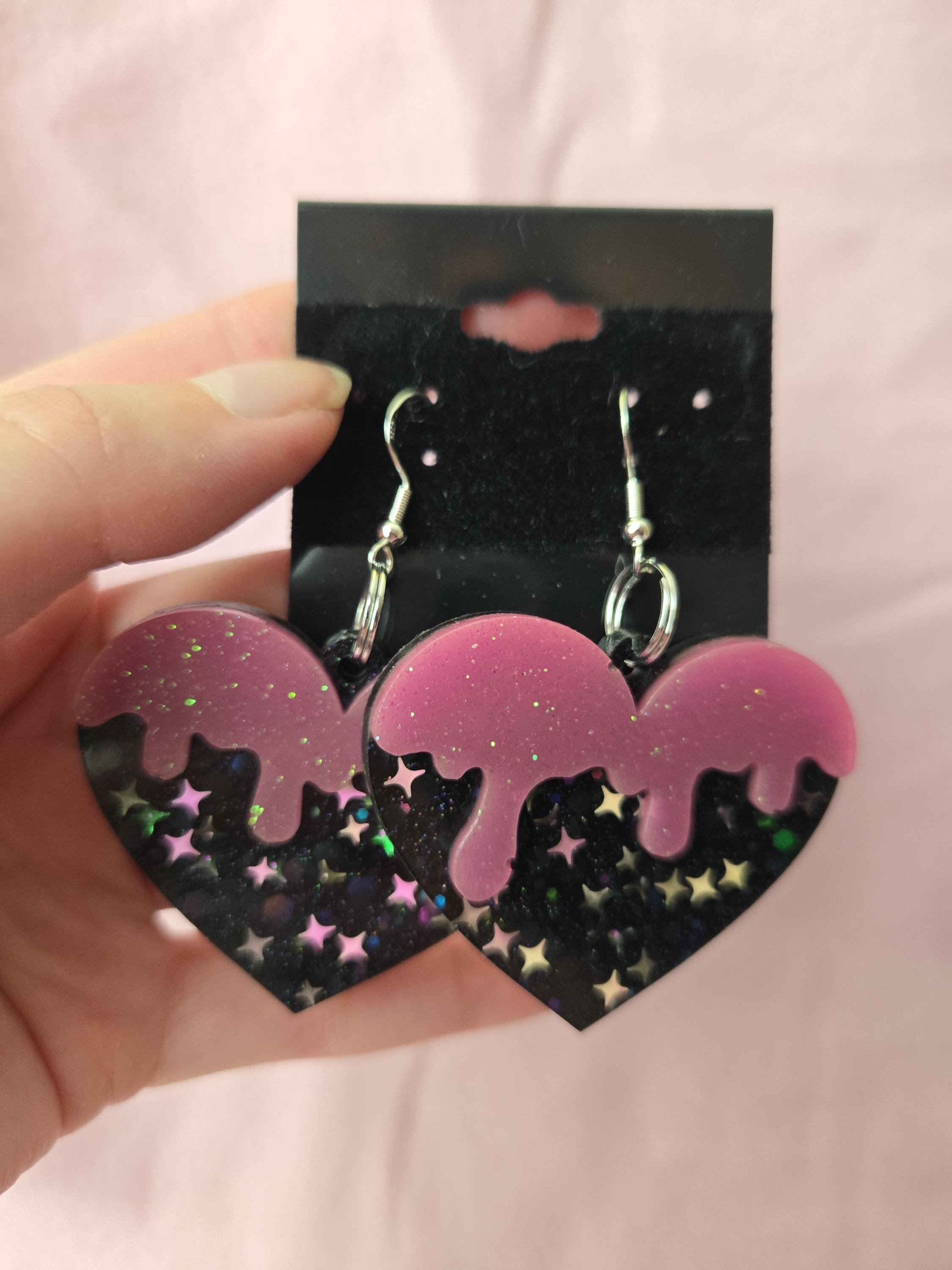 Handmade with love! These earrings are made with nickel-free metal & a glittery black and pink resin in a drippy heart design. Comes with a plastic earring stopper!