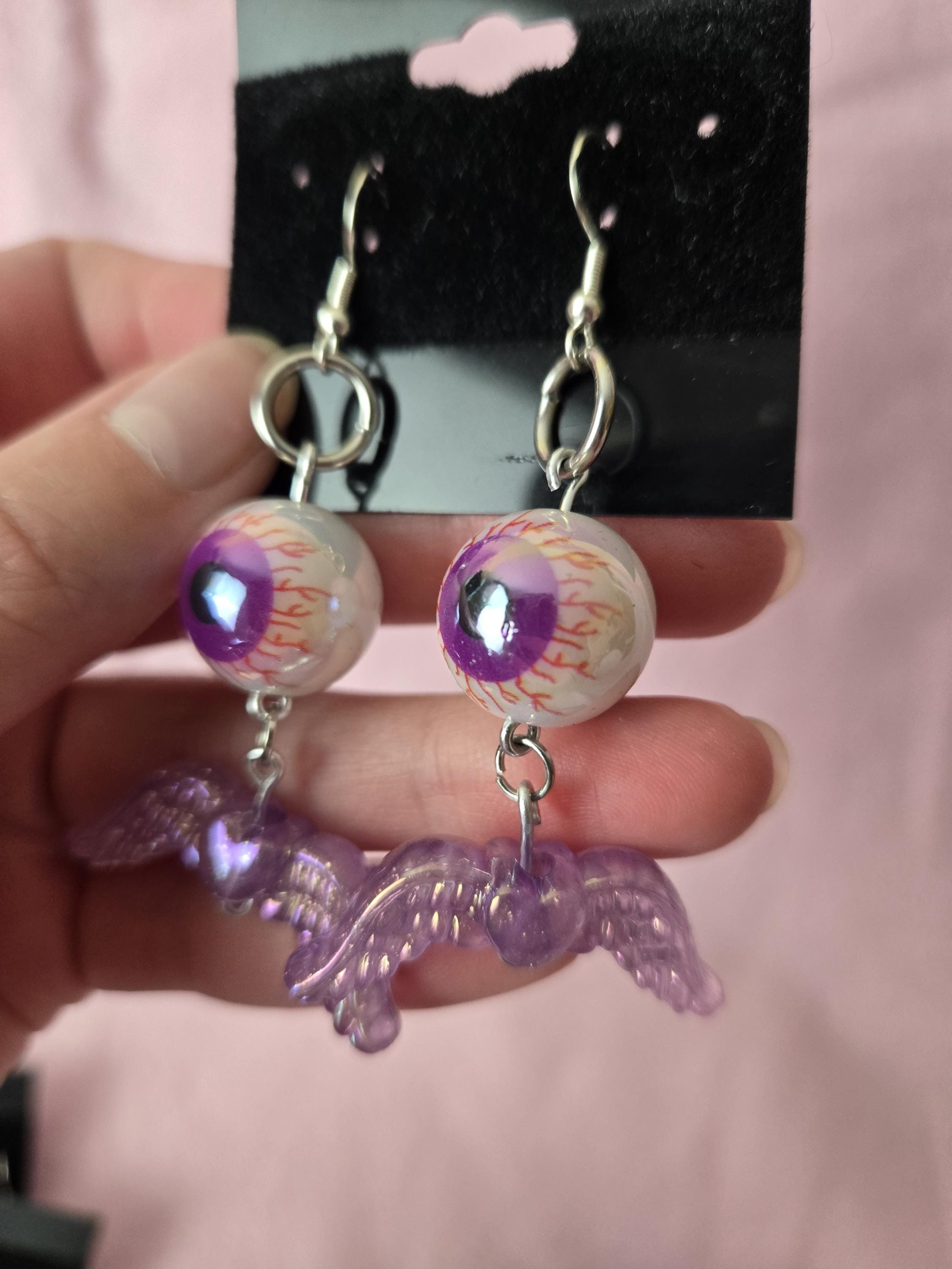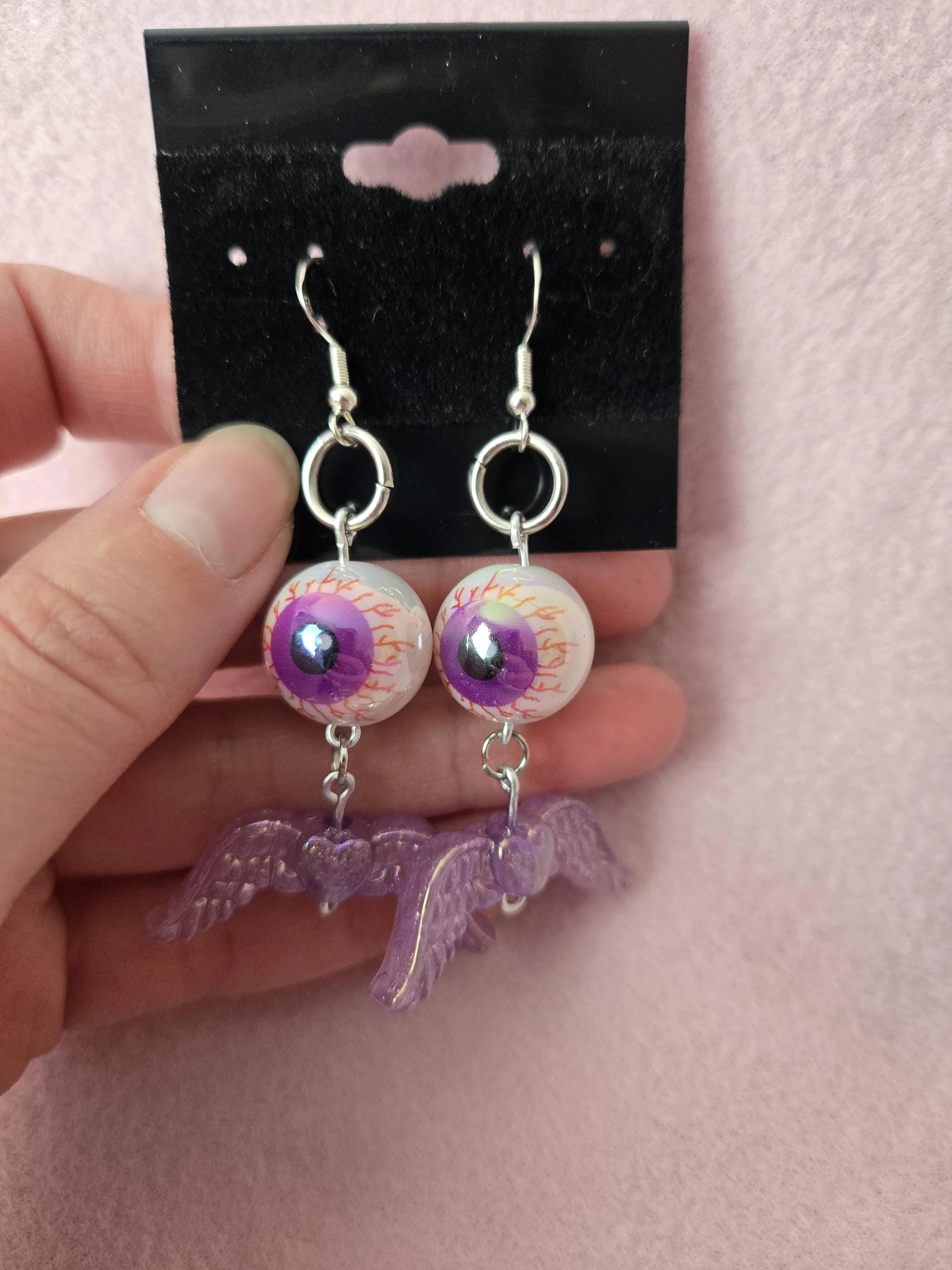 Handmade with love! These earrings are made with nickel-free metal & will catch the eye with their holographic eyeball and heart-wing charms. Comes with a plastic earring stopper!
