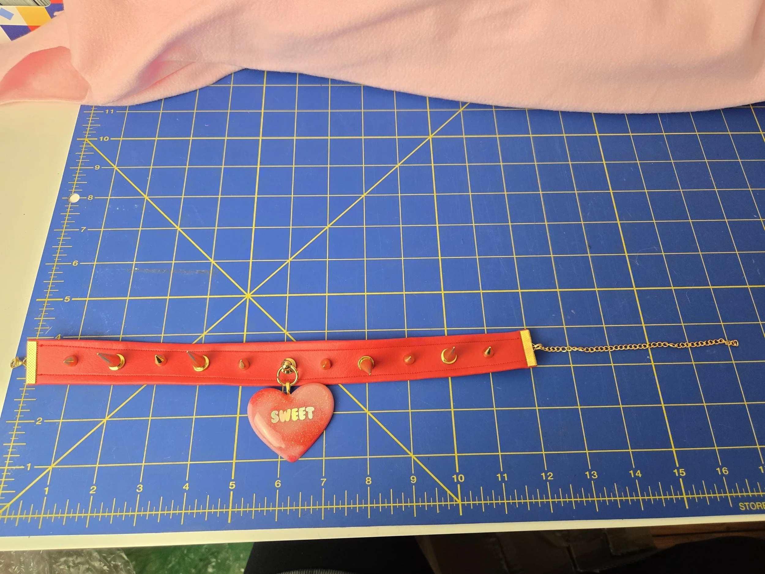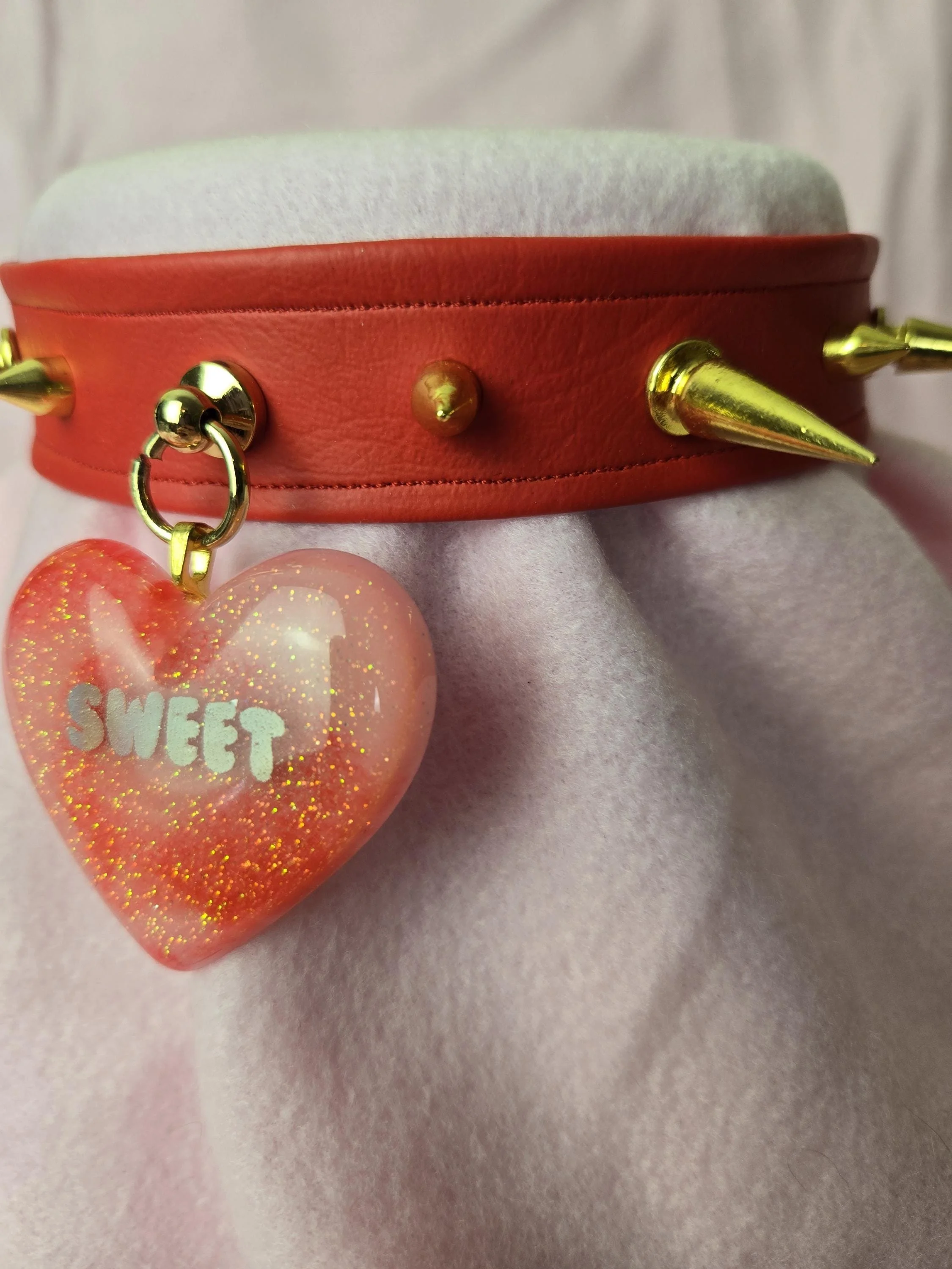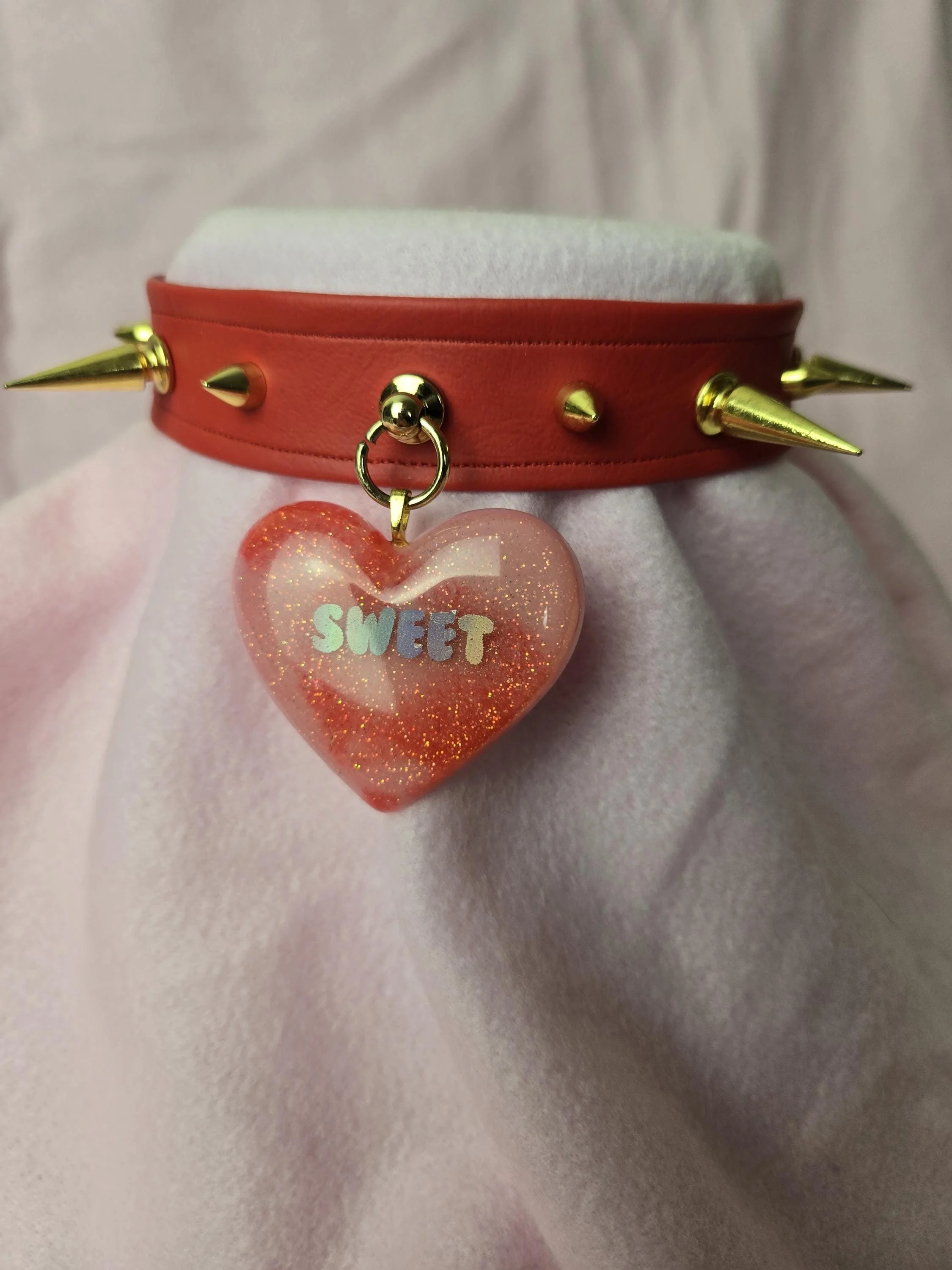 Super sweet! This pleather (faux leather) choker has a large, resin heart-shaped pendant with the word "sweet" in holographic lettering and small and large golden spikes.